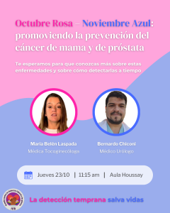 Los invitamos a participar de la charla “Octubre Rosa – Noviembre Azul: promoviendo la prevención del cáncer de mama y de próstata”, donde se abordarán aspectos fundamentales sobre estas enfermedades y la importancia de su detección temprana.